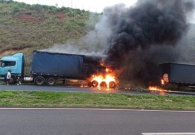 Carreta bitrem pega fogo no Contorno de Mandaguari