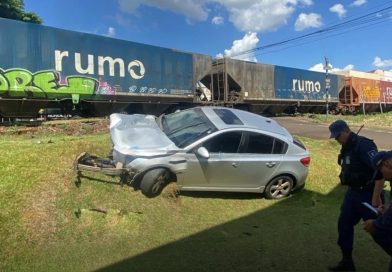 Colisão ocorreu em cruzamento ferroviário, apesar dos danos, ninguém ficou ferido Um carro foi atingido por um trem na tarde
