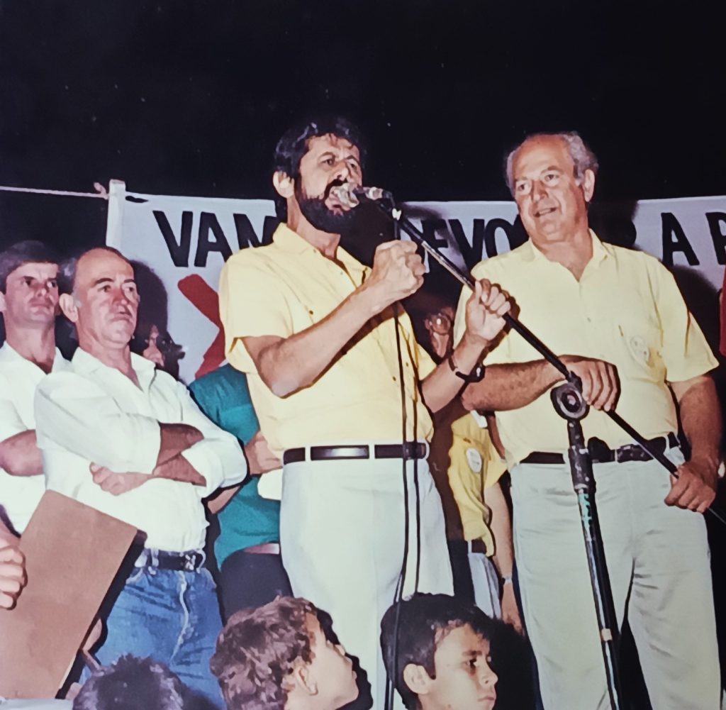 Hoje, 03 de outubro, completa 33 anos que Alexandre Elias Nacif, o Xandú, se elegeu prefeito de Mandaguari pela segunda vez. Com 6.945 votos, ele superou a votação do segundo e terceiro colocados juntos. Antônio Galera teve 3.919 votos e Dr. Osvaldo 2.290. Naquele ano de 1992, também disputaram a Prefeitura: Cyllêneo Pessoa Pereira (1.243 votos), Rubinho Beleze (525 votos) e Nilton Boti (300 votos). Na foto, feita durante a campanha, Xandú (à direita) acompanha o discurso de Noel Pires Viana, que disputou a reeleição e foi o vereador mais votado naquele ano.