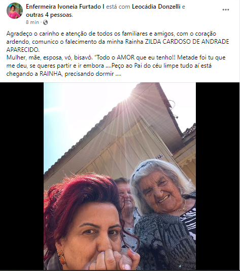 Através de seu perfil em redes sociais, Ivoneia confirmou o falecimento de dona Zilda, com uma nota de pesar.