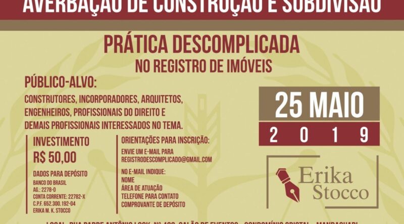 Informe Publicitário – O Registro de Imóveis de Mandaguari promove, no mês de maio, um curso que vai abordar averbação de construção e subdivisão.