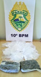 Um adolescente de 17 anos foi apreendido e uma jovem de 22 anos foi presa com cocaína e maconha na tarde da última sexta-feira (12), por volta das 14h15, na Avenida Anunciato Sonni, em Jandaia do Sul. Os abordados seriam moradores de Mandaguari. Durante patrulhamento, a equipe da Polícia Militar suspeitou do casal, que transitava em uma motocicleta Honda CG Titan. Na revista pessoal, os policiais encontraram dois invólucros de cocaína no bolso do adolescente. A passageira, por sua vez, carregava uma embalagem plástica contendo outros 55 invólucros da mesma droga. Questionados, ambos assumiram a propriedade dos entorpecentes e disseram que os venderiam em pontos aleatórios da cidade. Já na sede da companhia policial, uma busca minuciosa encontrou dois tabletes de maconha escondidos no tênis do adolescente.