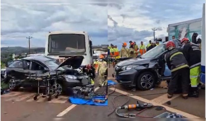 De acordo com as informações, a colisão envolveu um ônibus que transportava trabalhadores e dois automóveis. Com o impacto, uma das vítimas ficou encarcerada, sendo necessária a atuação do Corpo de Bombeiros para a retirada.