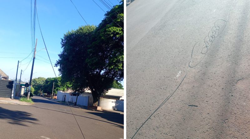 Há registro de fios caídos na via, o que representa risco principalmente para ciclistas e motociclistas, devido à possibilidade de enrosco e quedas.