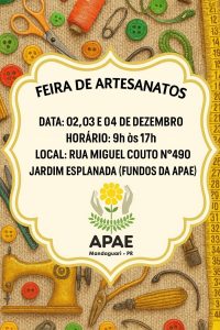A APAE convida toda a comunidade para prestigiar o evento, apoiar o trabalho realizado e levar para casa produtos artesanais cheios de significado.