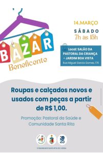 Neste sábado (14), acontecerá o bazar beneficente promovido pela Pastoral da Saúde e a Comunidade Santa Rita, da Paróquia Nossa Senhora Aparecida.