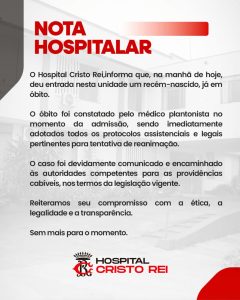 Em nota, o hospital informou que o recém-nascido deu entrada já em óbito e que todas as medidas assistenciais e legais foram adotadas, com o caso sendo comunicado às autoridades competentes.