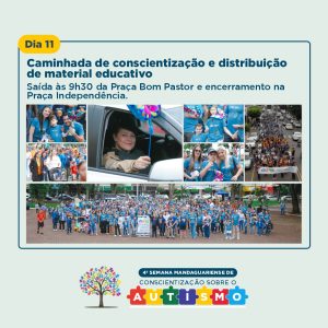 A Semana Mandaguariense de Conscientização sobre o Autismo será encerrada neste sábado (11), com a realização da caminhada de conscientização pelas ruas de Mandaguari. A mobilização, aberta a toda a comunidade, terá saída às 9h30 da Praça Bom Pastor e seguirá até a Praça Independência.