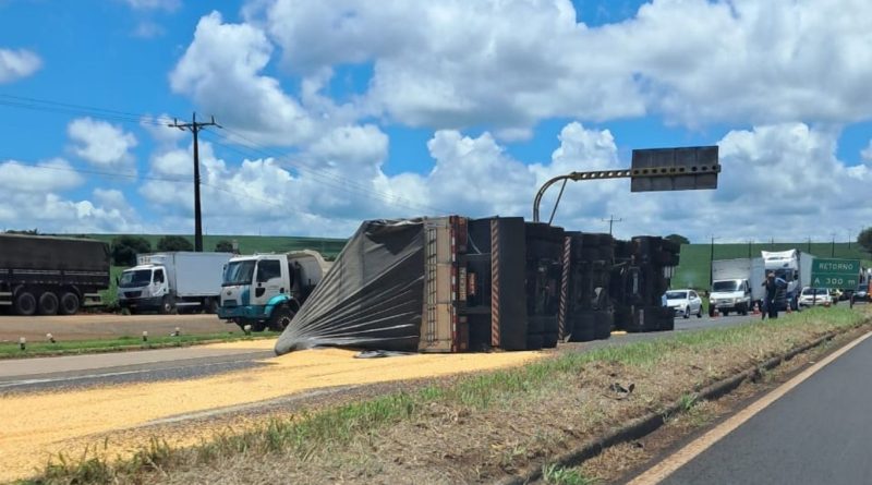 Caminhão carregado de milho tomba na BR-376 entre Mandaguari e Marialva