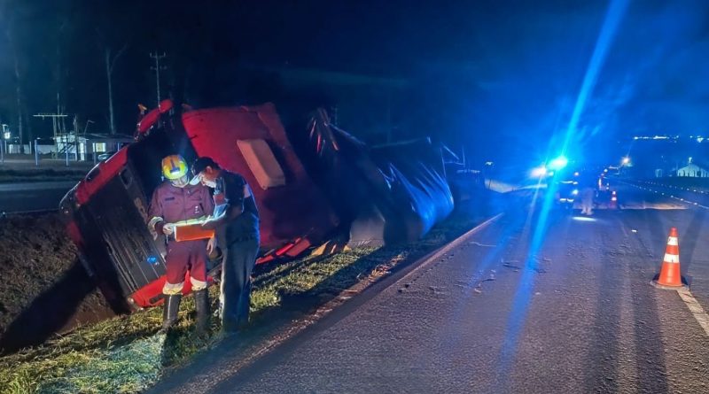 Um caminhão tombou na noite de quinta-feira (9) no trecho entre Jandaia do Sul e Mandaguari, mobilizando equipes da Polícia Rodoviária Federal (PRF) para o atendimento da ocorrência.