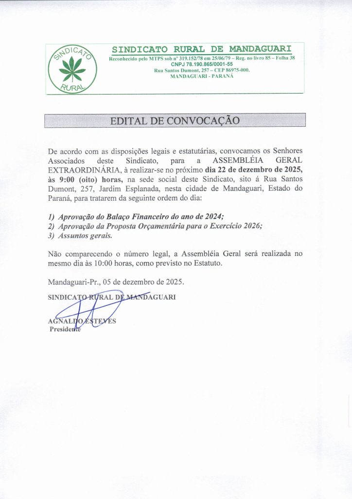 O Sindicato Rural de Mandaguari publicou edital convocando seus associados para uma Assembleia Geral Extraordinária que será realizada no dia 22 de dezembro de 2025, às 9h, na sede da entidade, localizada na Rua Santos Dumont, no Jardim Esplanada.