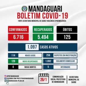 Com esses novos casos Mandaguari agora tem 6.716 casos positivos registrados desde o início do monitoramento e 5.494 pacientes se recuperaram da enfermidade e 125 perderam a vida por conta de complicações causadas pelo novo coronavírus.