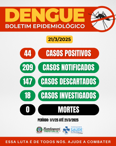 O atual balanço revela que Mandaguari não tem casos de chikungunya ou zika vírus no período epidemiológico vigente. Ao todo, Mandaguari tem, atualmente, 44 casos confirmados, 209 notificações, 35 casos descartados e 5 casos sob investigação. Não há mortes, até o momento, provocadas por dengue.