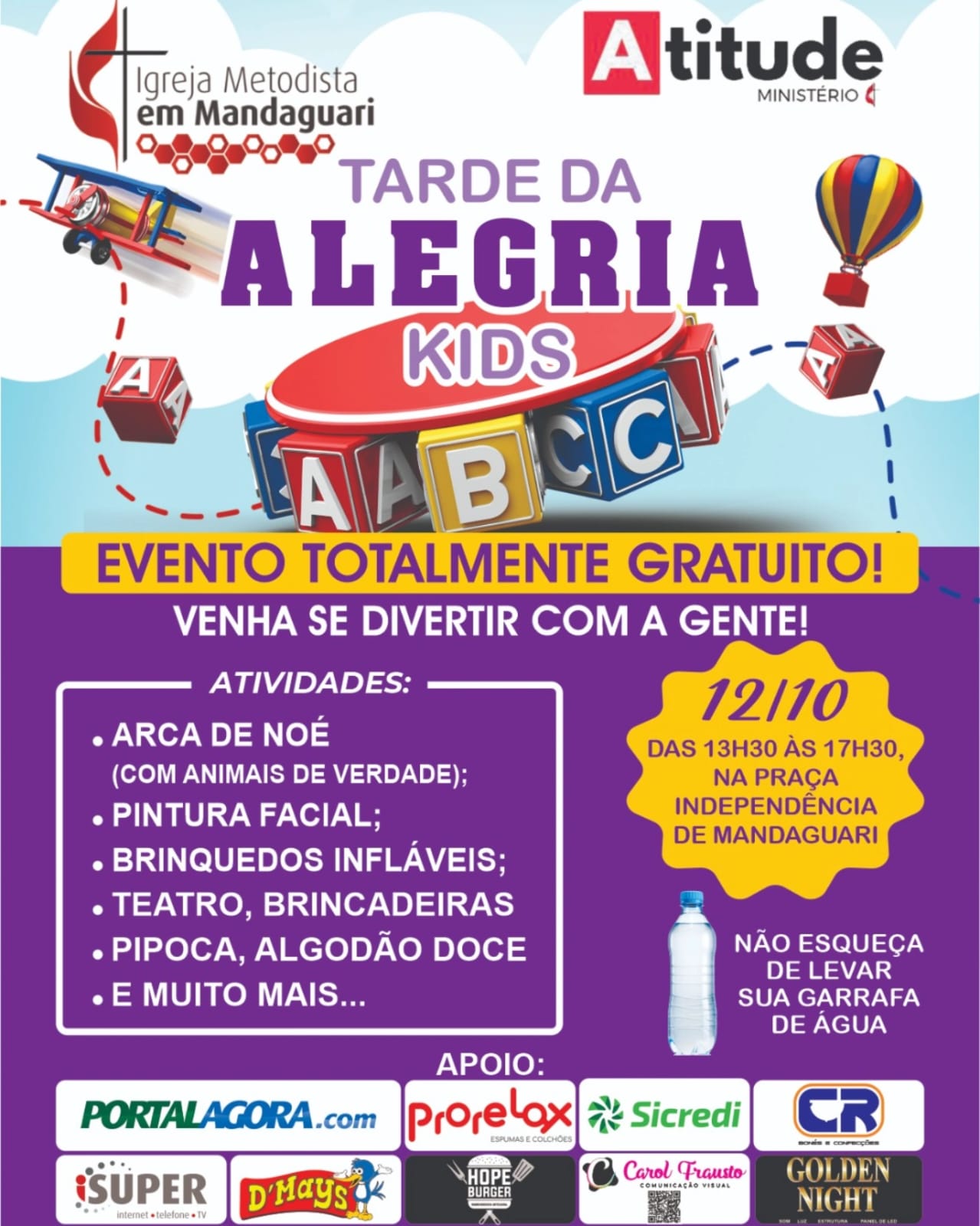 O evento acontece hoje, sábado (12/10) na Praça Independência a partir das 13h30, com distruibuição de 7 mil picolés, mil lanches, 5 estações de algodão doce e 3 de pipoca. A diversão fica por conta do Futsabão, cotonete, cama elástica, corrida de saco, torta na cara, bexiga d’agua e outras brincadeiras.