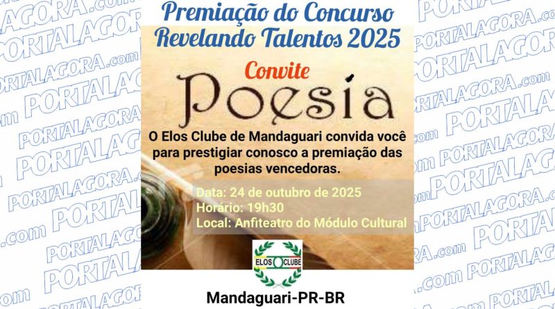 Com o objetivo de valorizar a expressão literária e revelar novos talentos da poesia, o Elos Clube de Mandaguari realiza nesta sexta-feira (24) a cerimônia de premiação do Concurso de Poesias “Revelando Talentos 2025”. O evento será às 19h30, no Anfiteatro do Módulo Cultural.