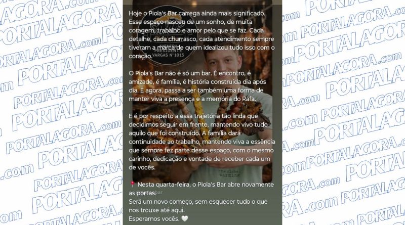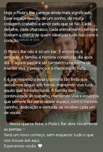 A família de Carlos Rafael do Carmo Piola irá manter o empreendimento Piola’s Bar em sua memória. O bar foi adquirido pela família para realizar o sonho de Carlos de ter seu próprio negócio.