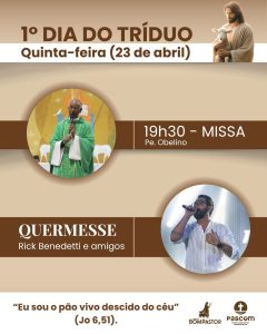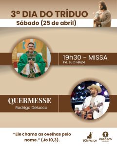 Ao longo do tríduo, de quinta-feira (23) a sábado (25), serão celebradas missas sempre às 19h30, presididas pelos padres Obelino, Reginaldo Teruel e Luiz Felipe, respectivamente. Após as celebrações, o público poderá participar das quermesses, que contarão com apresentações musicais de Rick Benedetti e amigos, Renan e Rodrigo, e Rodrigo Delucco.