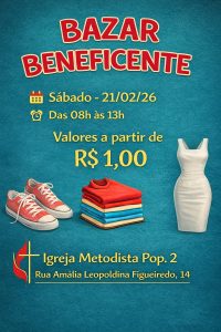 A Igreja Metodista do Populares 2 realiza neste sábado (21), um bazar beneficente com roupas e calçados.