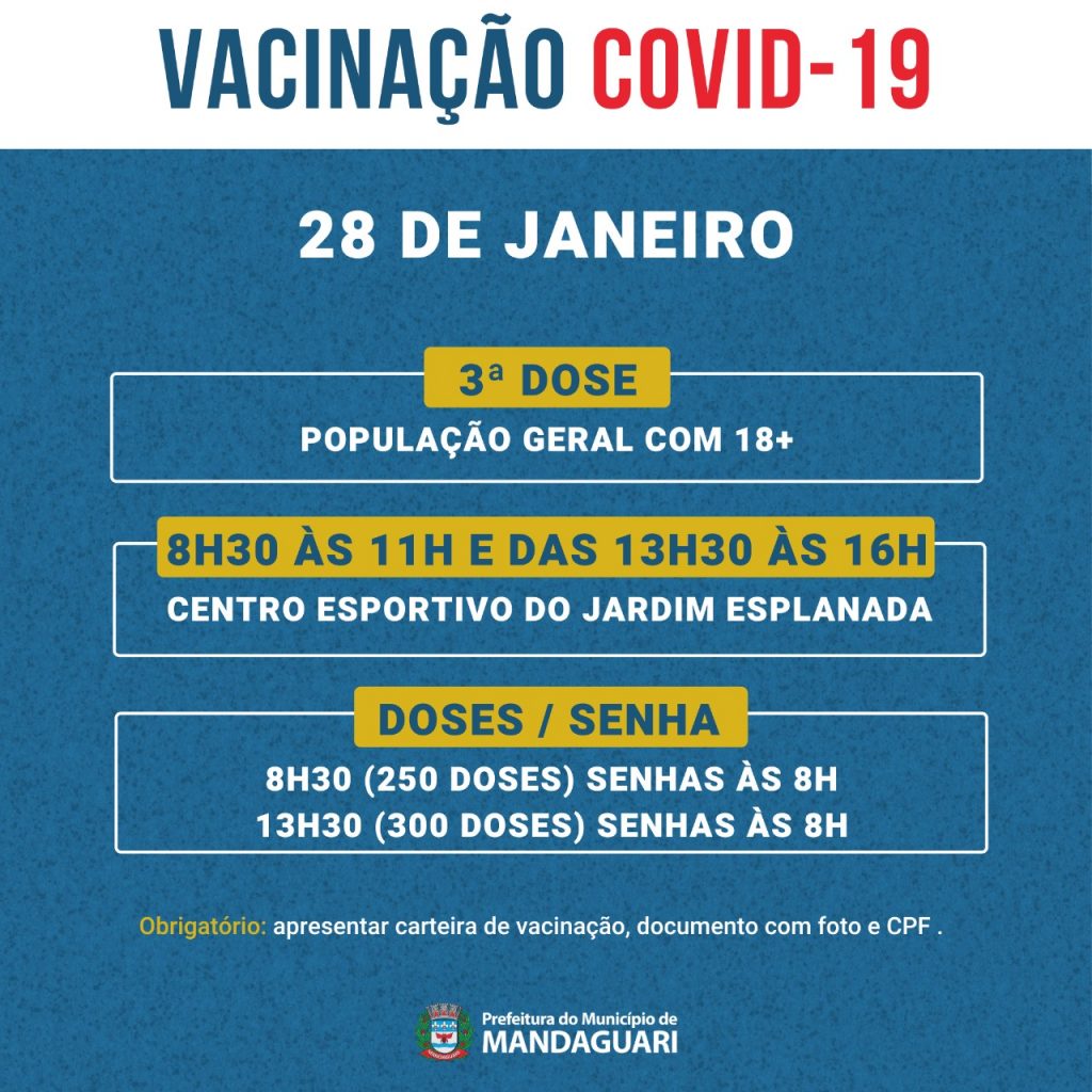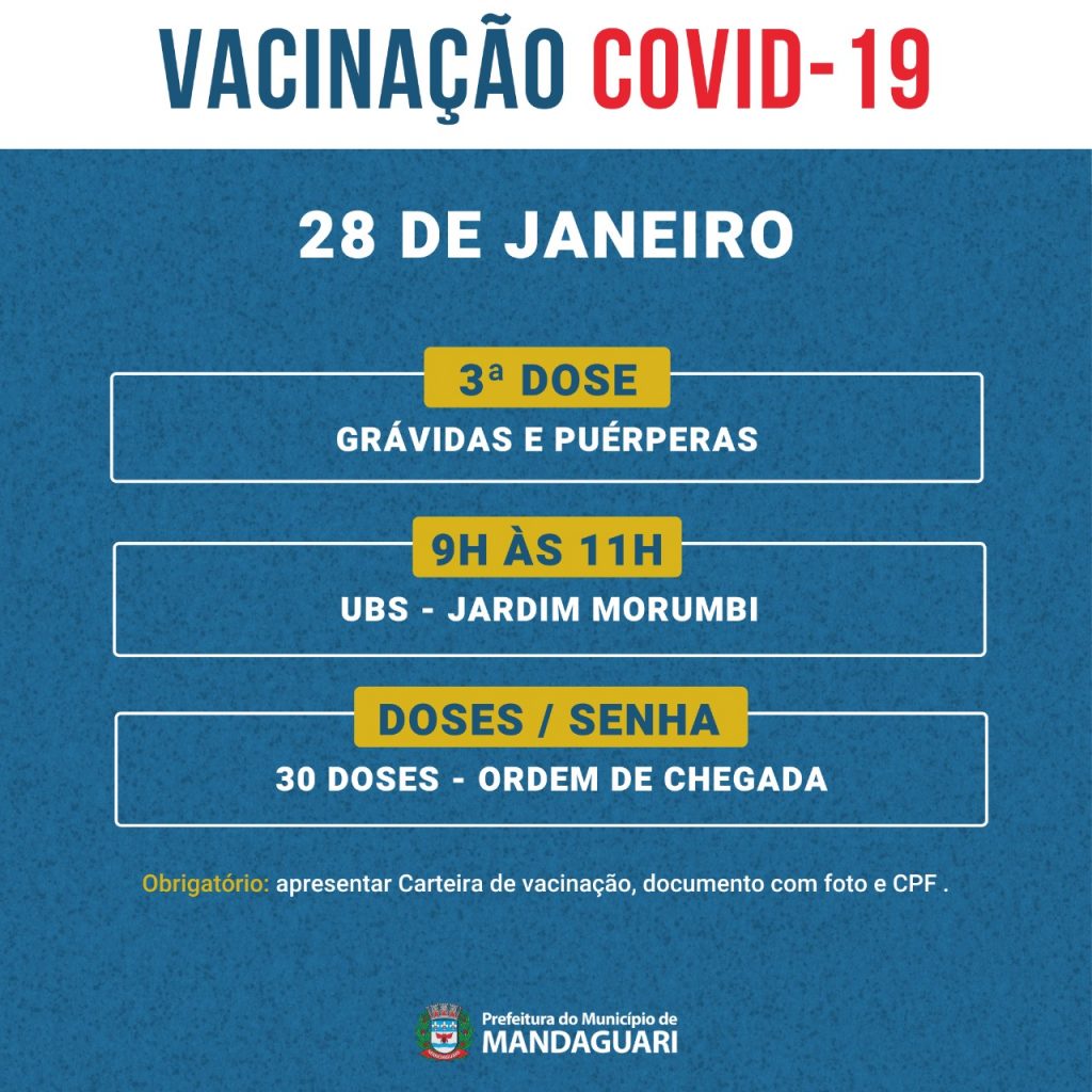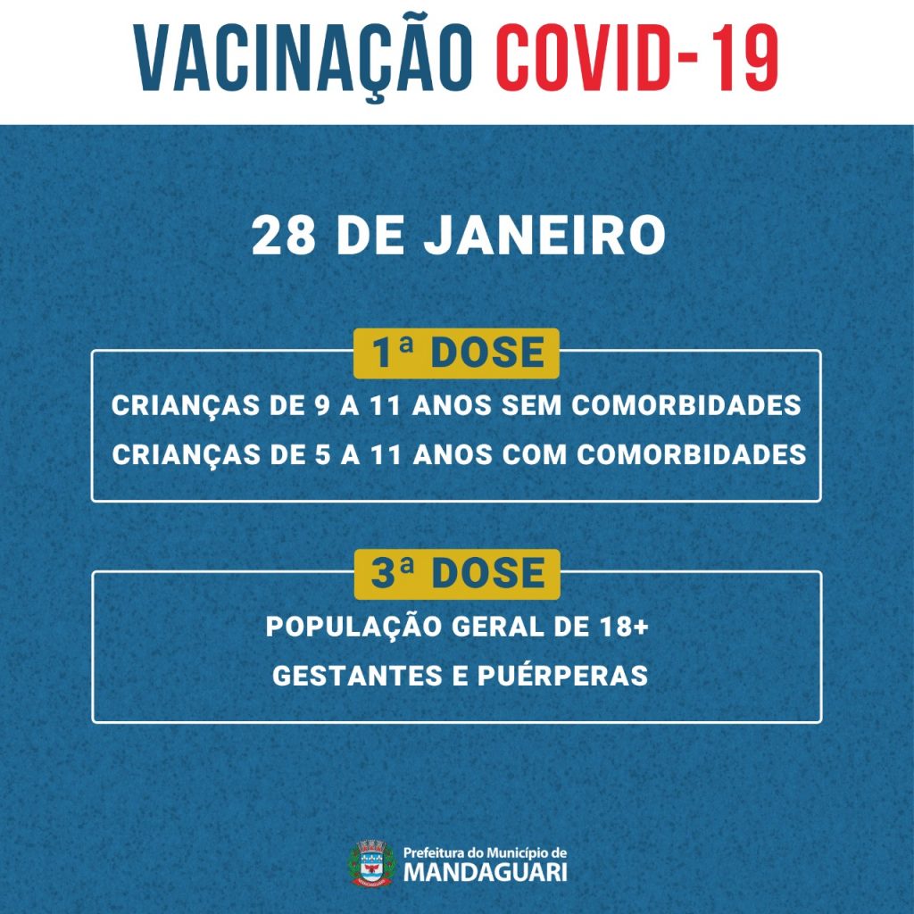 Mandaguari mantém a aplicação, na sexta-feira (28), da 1ª dose em crianças sem comorbidades de 9 a 11 anos e em crianças com comorbidades de 5 a 11 anos e da 3ª dose de Pfizer em moradores de 18+ e em gestantes e puérperas.