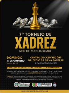 O 7º Torneio de Xadrez RPD, válido para o rating internacional FIDE, acontece neste domingo (19), a partir das 12h, no Centro de Convenções Dr. Décio da Silva Bacelar, em Mandaguari. O evento já conta com 200 inscritos, mas devido a desistências, ainda é possível se inscrever e ficar na fila de espera, podendo ser chamado caso haja vagas disponíveis.