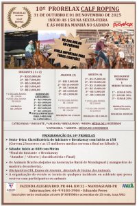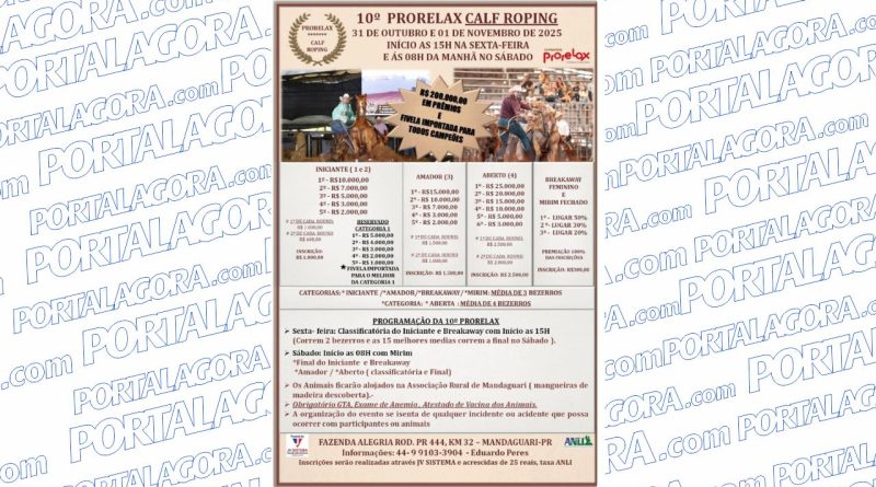 Nos dias 31 de outubro e 1º de novembro de 2025, Mandaguari receberá a 10ª edição do Prorelax Calf Roping, uma das principais competições da modalidade no país. O evento será realizado na Fazenda Alegria, localizada no quilômetro 32 da Rodovia PR-444, e reunirá competidores de diversas categorias.