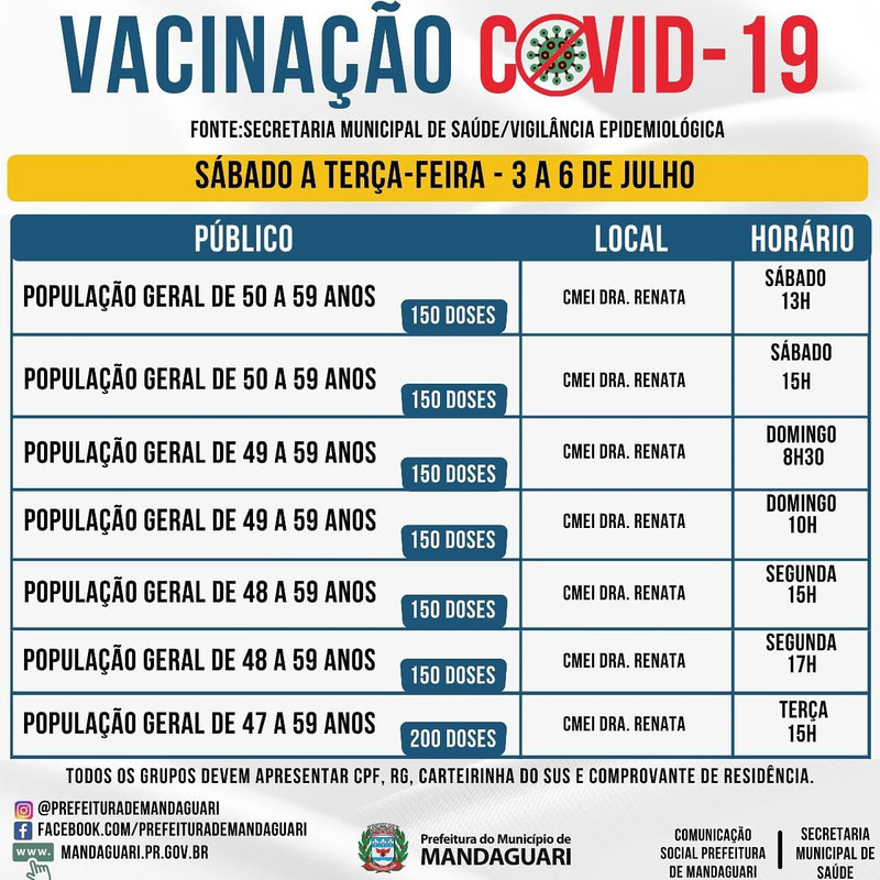 A Saúde de Mandaguari divulgou cronograma informando que neste sábado (3) irá vacinar a população geral a partir de 50 anos contra a Covid-19. Hoje a imunização ocorrerá às 13h e às 15h no CMEI Dra. Renata (antigo prédio da Escola Pallotti, anexo à Paróquia Nossa Senhora Aparecida).