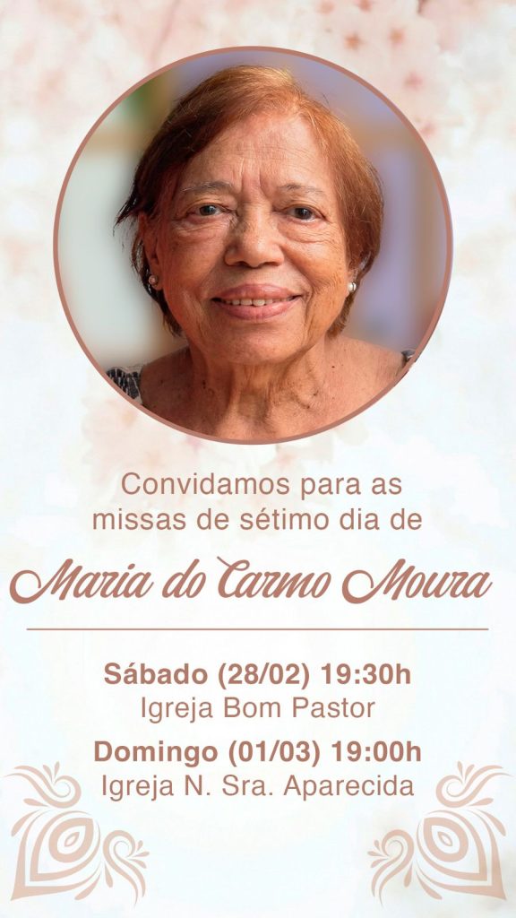 A família de Maria do Carmo Moura convida familiares e amigos para a missa de 7° dia em sua memória.