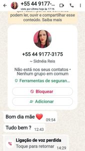 Golpistas estão utilizando o nome e a imagem de Sidnéia Reis para tentar aplicar golpes por meio de mensagens e contatos falsos. A situação foi relatada após a própria Sidnéia alertar que pessoas estão se passando por ela, utilizando números que não pertencem à moradora.
