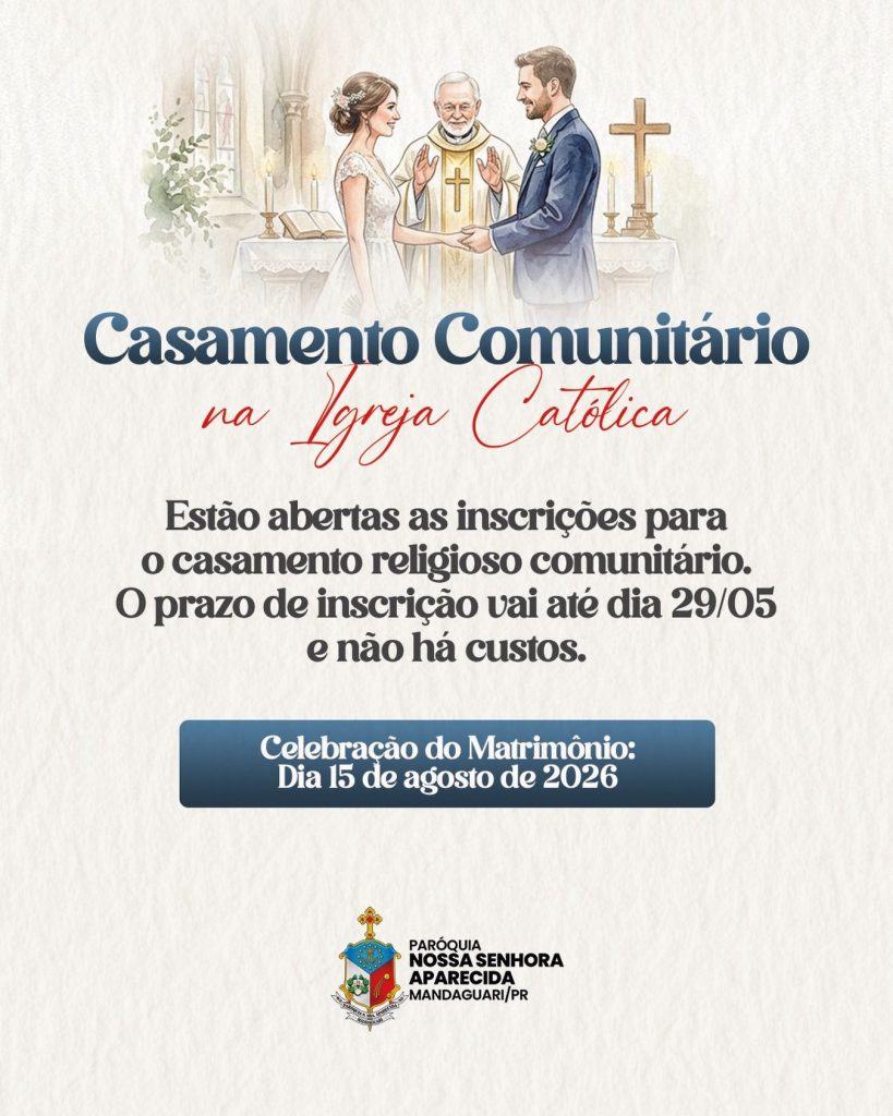A Paróquia Nossa Senhora Aparecida, está com inscrições abertas para o casamento comunitário que será celebrado em agosto de 2026, durante a tradicional Semana da Família.