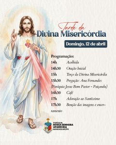 A Paróquia Nossa Senhora Aparecida realiza neste domingo (12) a Tarde da Divina Misericórdia. A programação começa às 14h e deve reunir entre 200 e 300 pessoas ao longo da tarde.