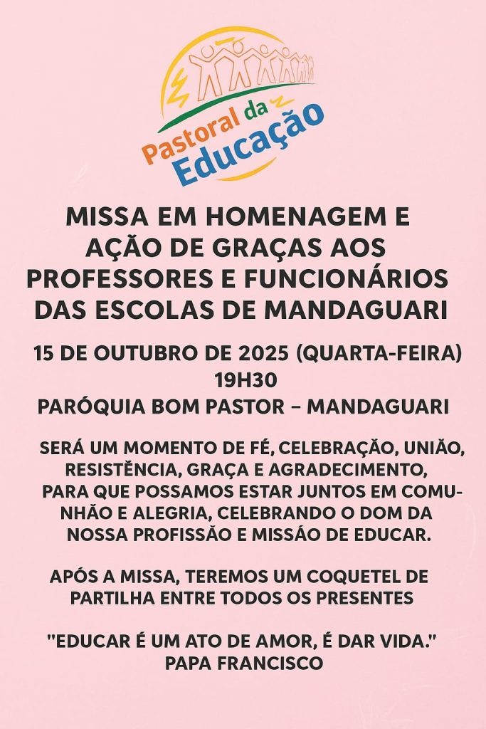 A Pastoral da Educação de Mandaguari promoverá, no próximo dia 15 de outubro, uma missa em homenagem e ação de graças aos professores e funcionários das escolas do município. O evento será realizado às 19h30, na Paróquia Bom Pastor, e faz parte das comemorações pelo Dia do Professor.