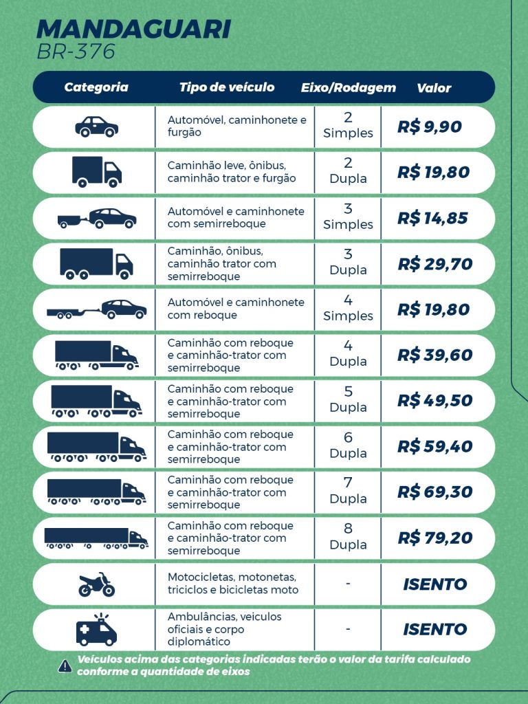 Em Mandaguari, a tarifa básica para veículos de passeio foi fixada em R$ 9,90. Já nas demais praças, os valores definidos são de R$ 10,50 em Arapongas, R$ 13,50 em Presidente Castelo Branco e R$ 17,10 em Jataizinho. As demais categorias seguem tabela específica conforme o tipo de veículo.