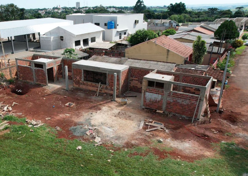 Nesta fase da obra é possível visualizar a estrutura dos vestiários em alvenaria, com paredes levantadas, além do avanço na construção da arquibancada.