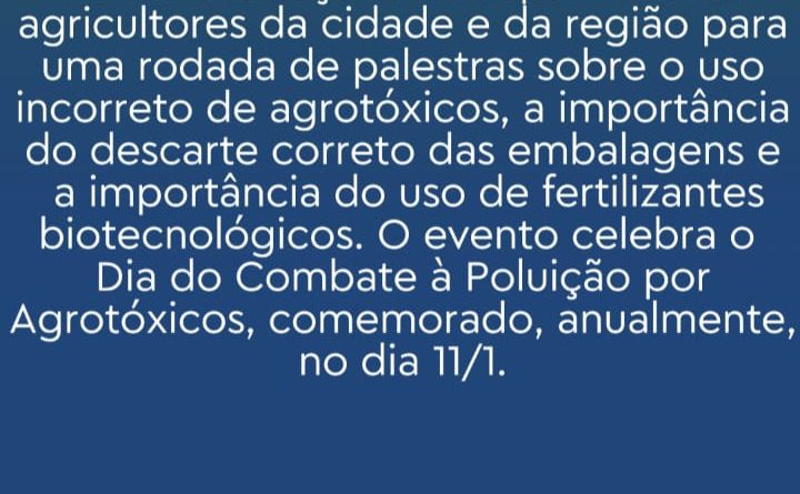 As palestras serão sobre uso correto de agrotóxicos, importância do descarte correto das embalagens e do uso de fertilizantes biotecnológicos.