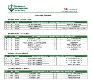 A programação conta com jogos intensos desde a quinta-feira (30), com equipes como P.M. Mandaguari, P.M. Astorga, Duque de Caxias, Ponta Grossa Basquete, Guarapuava, P.M. Castro e Al11 Sports disputando as fases classificatórias. As semifinais estão previstas para o sábado (1º/11), seguidas pela grande final no domingo (2/11), às 11h15, quando será conhecido o campeão estadual da categoria.