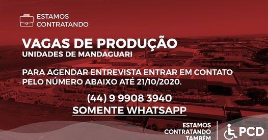 Interessados em preencher as vagas devem agendar entrevista somente por WhatsApp, através do número (44) 9 9908-3940 até esta quarta-feira (21).