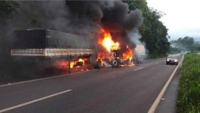 Com o impacto da batida, as carretas ficam presas e uma delas pegou fogo. O rapaz ficou preso às ferragens e morreu carbonizado.