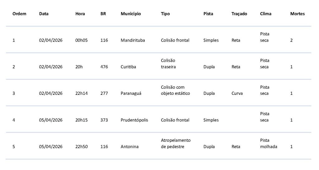A Polícia Rodoviária Federal (PRF) registrou 112 acidentes, 106 pessoas feridas e seis mortes durante a operação Semana Santa 2026 nas rodovias federais do Paraná, realizada entre os dias 2 a 5 de abril. No feriado do ano passado, foram registrados 110 acidentes, 119 pessoas feridas e sete mortes. Na ocasião, a operação teve cinco dias e abarcou também o feriado de Tiradentes.