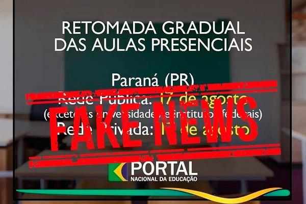 A Secretaria de Estado da Educação e do Esporte esclarece que ainda não há data definida para o retorno das aulas presenciais no Paraná. A informação de que a volta estaria marcada para 17 de agosto é falsa. A secretaria alerta que qualquer definição de retorno será informada pelos canais oficiais da Educação: o site http://www.educacao.pr.gov.br e as redes sociais oficiais da Seed (Facebook e Instagram).