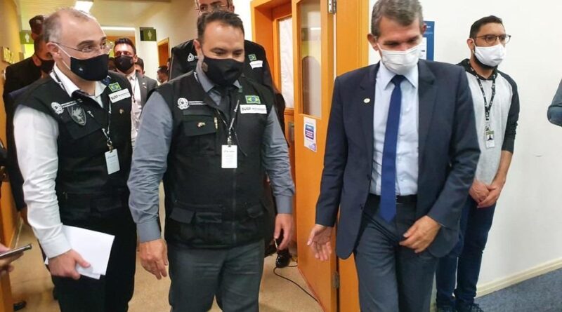 O Ministro da Justiça e Segurança Pública, André Mendonça, o diretor-geral da PF, Rolando Alexandre de Souza e Jorge Oliveira, ministro da Secretaria-Geral da Presidência, participaram do evento que tratou do balanço de uma nova fase da operação, em Foz do Iguaçu, no oeste do Paraná.
