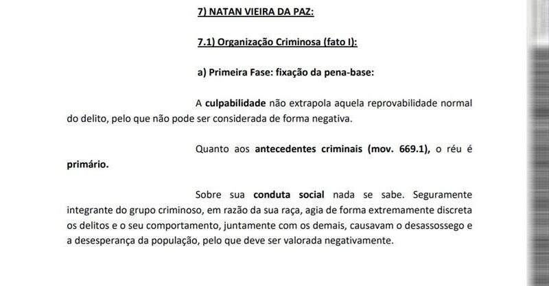 O trecho que menciona a raça de Natan aparece três vezes no documento no momento em que a magistrada aplica a dosimetria da pena.