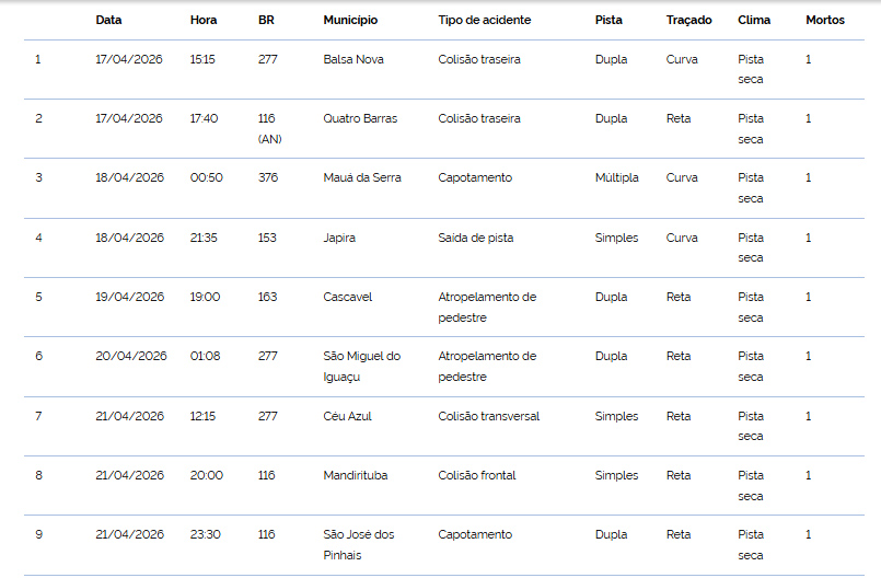 O acidente mais grave foi registrado na sexta, na BR-277, em Balsa Nova, em um engavetamento envolvendo nove veículos e que resultou na morte de uma pessoa.