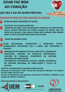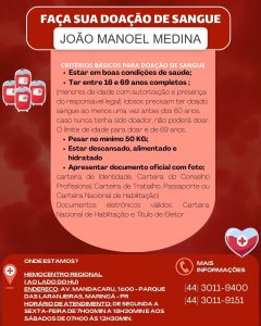 As doações podem ser realizadas no Hemocentro Regional (ao lado do Hospital Universitário), localizado na Avenida Mandacaru, nº 1600 – Parque das Laranjeiras, em Maringá. O horário de atendimento é de segunda a sexta-feira, das 7h às 18h30, e aos sábados, das 7h às 12h30.