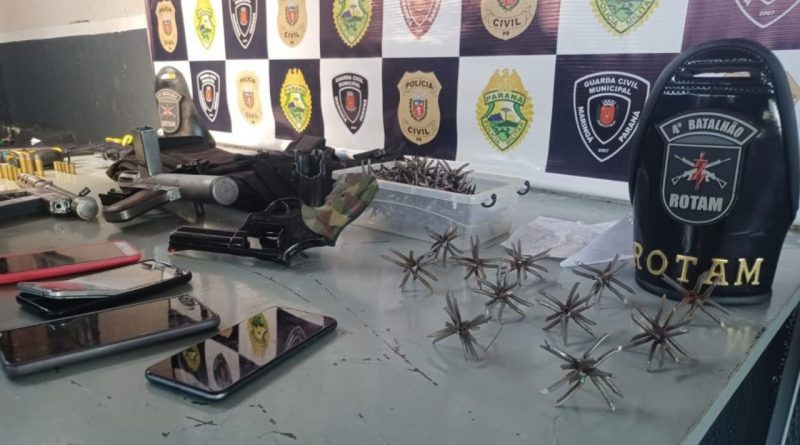 Na tarde desta terça-feira (24) uma equipe da Rotam do 4°Batalhão de Polícia Militar (BPM) apreendeu, na zona norte de Maringá, duas metralhadoras de fabricação caseira, um revólver calibre 357, munições, capuzes, colete balístico, centenas de pregos e ferros retorcidos, além de outros apetrechos.