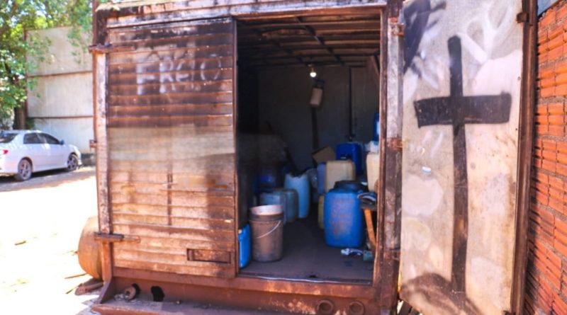 No galpão os policiais encontraram engradados com garrafas de Vodca e outras bebidas de marcas conhecidas, todas vazias. Também foram localizados dois contêineres lacrados contendo mais de 50 galões com combustíveis e lubrificantes, entre eles gasolina, óleo e querosene, armazenados em embalagens diferentes das originais.