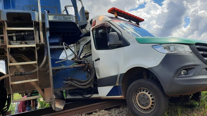 Uma ambulância foi atingida por uma locomotiva e arrastada por cerca de 200 metros na passagem de nível conhecida como Panela de Pedra, neste sábado (14), em Jandaia do Sul.