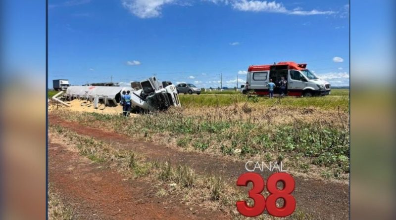 Caminhão carregado com grãos capota na PR-444