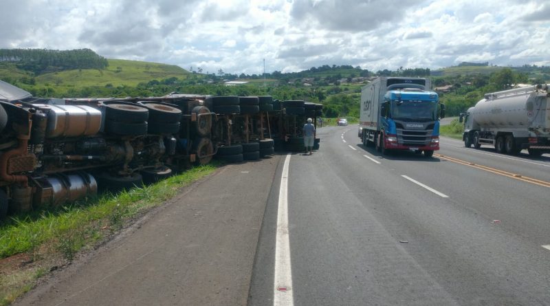 A carga, que seria de adubo, ficou espalhada no acostamento. O tombamento não bloqueou a rodovia.
