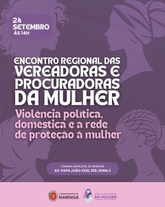 A Procuradoria da Mulher da Câmara Municipal de Maringá, sob representação da vereadora Professora Ana Lúcia, realizará no dia 24 de setembro, das 14h às 17h, no Plenário da Câmara, o Encontro Regional de Vereadoras e Procuradoras da Mulher: Violência Política, Doméstica e a Rede de Proteção à Mulher.