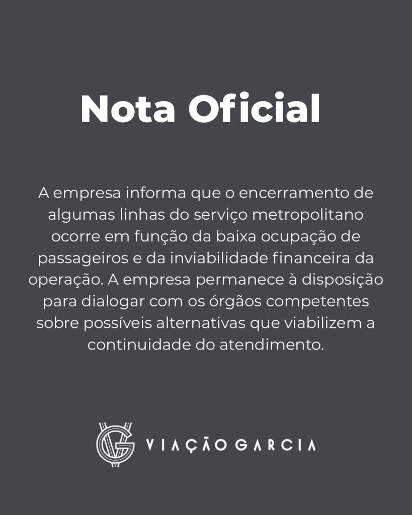 A Viação Garcia informou que irá encerrar a operação de diversas linhas intermunicipais no Paraná, especialmente na região Norte do estado. A medida já foi protocolada junto ao Departamento de Estradas de Rodagem do Paraná (DER/PR) e deve entrar em vigor a partir de 1º de maio de 2026.